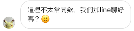 這種帳號,早期就是在狀態欄留自己的Line ID,進行援交詐騙,後來可能是交友軟體有在取締這種現象,開始變成配對之後,開頭第一句話就是援交詐騙的訊息,相信各個交友軟體都有在封鎖類似帳號,但手法仍是層出不窮,想必仍是有許多用戶還是會被騙,只能警惕彼此了。(延伸閱讀:用了交友軟體還是沒對象?4個交友壞習慣先改過來!)